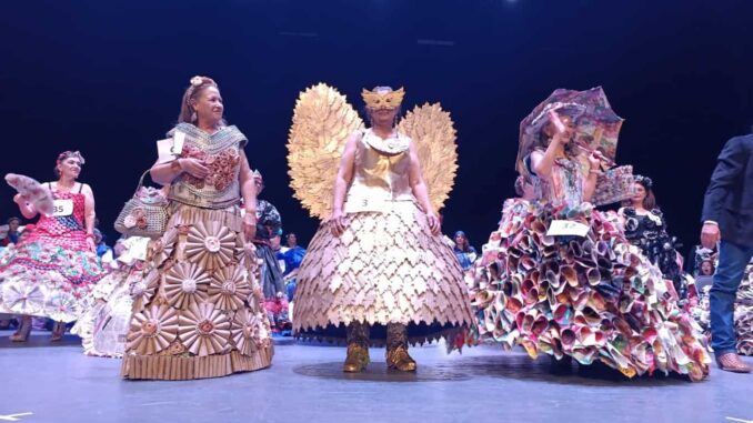 El Teatro de la Ciudad se llenó de aplausos mientras las participantes desfilaron con prendas elaboradas a partir de materiales reciclados. Con paso firme, entusiasmo y un inigualable carisma, las abuelitas modelaron diseños creados con cartón, plástico, papel y otros materiales recuperados, demostrando que el reciclaje también puede convertirse en arte, moda y expresión personal.