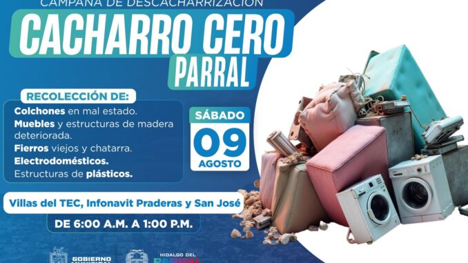 Este sábado 9 de agosto de 6:00 de la mañana a la 1:00 de la tarde se llevará a cabo la recolección de cacharros en las colonias Villas del Tec, Infonavit Praderas y San José, donde se exhorta a la ciudadanía a colaborar sacando objetos en desuso como llantas, muebles viejos, electrodomésticos y otros artículos que ya no tengan utilidad en el hogar.
