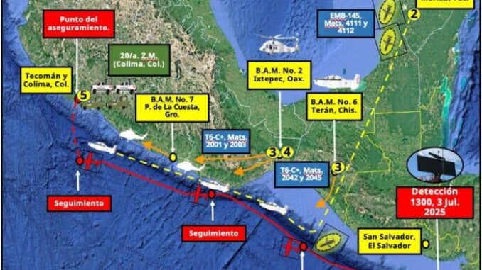 El secretario de Seguridad Ciudadana del gobierno federal, Omar García Harfuch, explicó que la aeronave con droga asegurada en Tecoman, Colima, fue detectada el 3 de julio de 2005 a 200 kilómetros al sur de San Salvador, El Salvador.