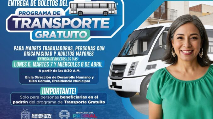 La Dirección de Desarrollo Humano y Bien Común, informa a las y los beneficiarios del programa Transporte Gratuito que la entrega de boletos correspondientes al mes de abril se realizará del 6 al 8 del presente mes.