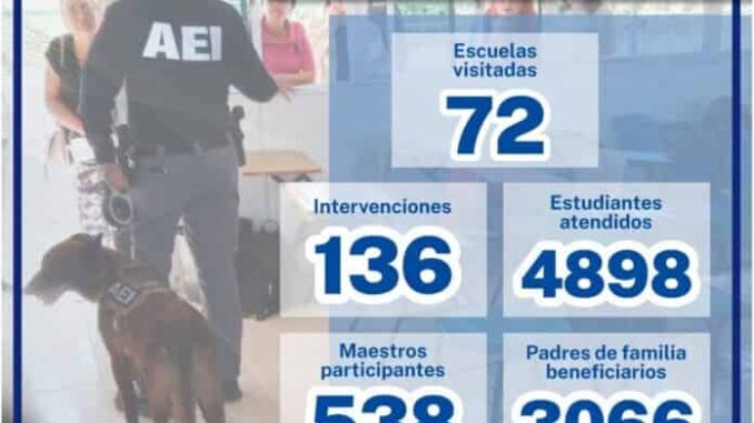 Lo anterior, por medio de 136 intervenciones en 72 planteles educativos desde el nivel básico, con preescolar, primaria y secundaria, hasta nivel medio superior, visitados como parte de las jornadas de prevención y protección a la comunidad escolar.