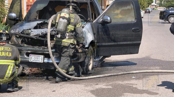 Chihuahua.- El estruendo y las llamas sorprendieron a vecinos de la colonia Santa Rita la tarde de este sábado, cuando una camioneta pick-up Ford, de modelo antiguo, comenzó a arder frente a un domicilio ubicado en el cruce de las calles 26 y Primero de Mayo.