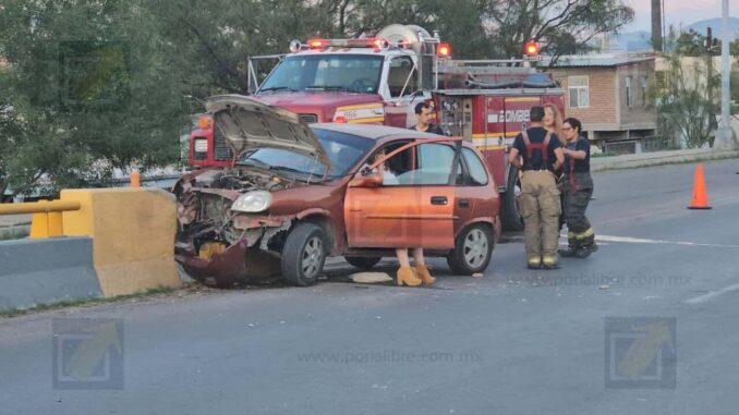 Chihuahua.- Una conductora que viajaba a bordo de un automóvil Chevrolet Chevy color cobre protagonizó un accidente vial este sábado en el bulevar Fuentes Mares, cuando se dirigía de oriente a poniente y, al aproximarse al puente que conecta con la vialidad Ch-P, perdió la visibilidad a causa del sol. La falta de claridad le impidió maniobrar con seguridad y terminó por estrellarse contra el muro de contención justo antes de subir la pendiente.