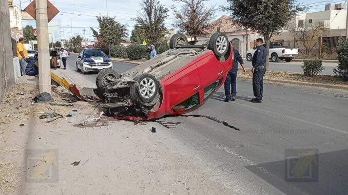 De acuerdo con el reporte, el conductor de un vehículo Nissan March de color rojo circulaba de norte a sur cuando chocó contra un camión de carga perteneciente a una empresa de tarimas. Tras el impacto, el automovilista perdió el control del volante y terminó estrellándose contra la protección de un poste de la Comisión Federal de Electricidad, provocando que el vehículo volcara y quedara sobre su toldo.