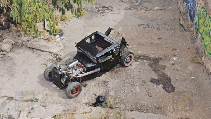 El conductor de un Ford Modelo A resultó con golpes leves luego de que la unidad, alterada en su motor, cayera a un canal de aguas negras de aproximadamente 15 metros de profundidad
