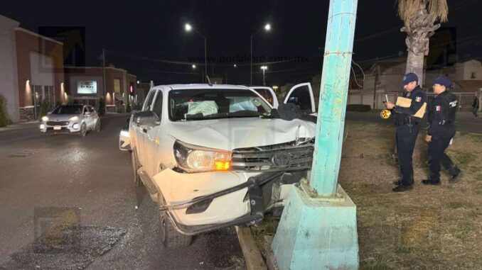 Noticias de Chihuahua.- Un accidente vial se registró frente a Plaza Miguel, sobre la calle Club de Leones, en el acceso hacia la colonia Romanza, donde una pickup Toyota Hilux color blanco, modelo reciente, se impactó contra una luminaria.