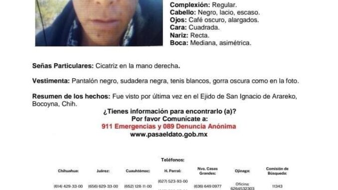 Camilo fue visto por última vez el 27 de abril en el Ejido de San Ignacio de Arareko, Bocoyna.
