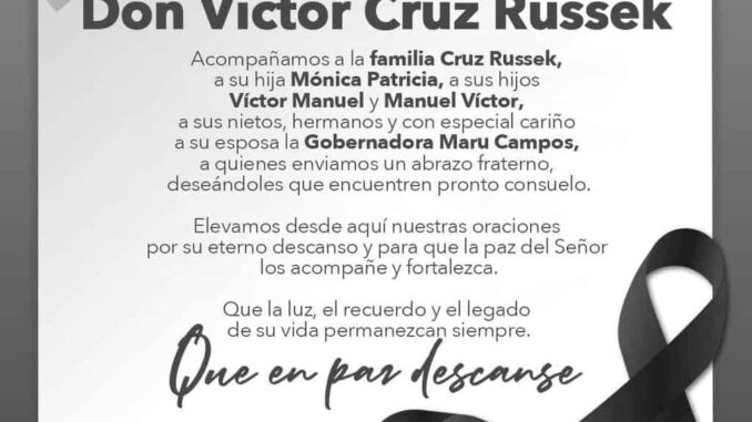 Abrazo solidariamente a toda la familia Cruz Russek, a sus hijos Mónica Patricia, Víctor Manuel y Manuel Víctor y de manera muy especial a su Señora esposa, nuestra Gobernadora Maru Campos, rogando a Dios que el Altísimo les dé consuelo en estos difíciles momentos.