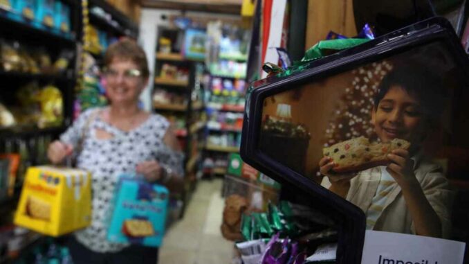 Personas sostienen cajas con panetones en una tienda este martes, en Lima (Perú). EFE/ Paolo Aguilar