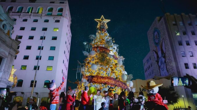 Luego del conteo regresivo en el que más de 5 mil chihuahuenses participaron, el alcalde Marco Bonilla presionó el botón que encendió el árbol de Navidad y toda la decoración que el Gobierno Municipal instaló en la Plaza de Armas, para dar inicio a las fiestas navideñas.