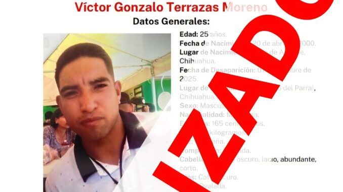 Como resultado de la activación y seguimiento de los protocolos de búsqueda, este martes 18 de noviembre, la Fiscalía de Distrito Zona Sur localizó sano y salvo a Víctor Gonzalo T. M., de 25 años de edad, quien contaba con reporte de ausencia, interpuesto el 07 de octubre del presente año, en la ciudad de Parral.