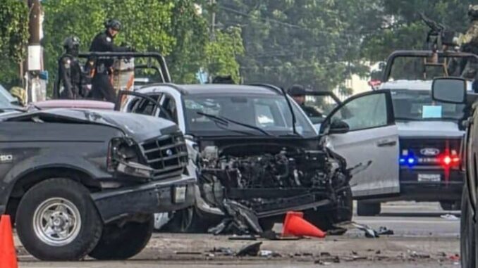 La camioneta del titular de la #SSPyTM de #Culiacán, impactó a la unidad donde viajaban a los agresores, lo que ocasionó que esta chocara contra otra camioneta negra que circulaba frente a una… pic.twitter.com/gMbgimXd62