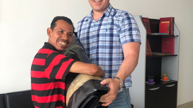 Durante los recorridos, se otorgó un paquete de 100 metros de hule negro al joven Ramón Rocha, vecino del albergue Los Carrizos, quien gestionó este material para distribuirlo entre sus vecinos.