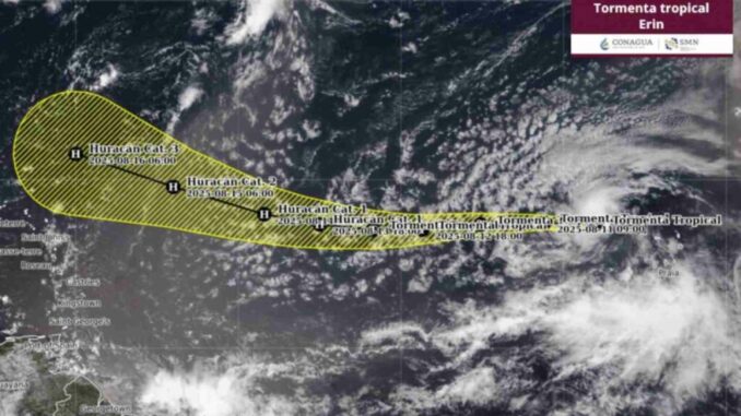 De acuerdo con los últimos informes de la Comisión Nacional del Agua (Conagua), “Erin” se intensificó a huracán de categoría 1 en la escala Saffir Simpson. Debido a su distancia y desplazamiento no representa peligro para costas nacionales.