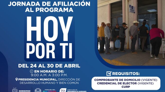 La Dirección de Desarrollo Humano y Bien Común, informó que la jornada de afiliación al programa “Hoy Por Ti” se extenderá una semana más, del 24 al 30 de abril, en las instalaciones de la Presidencia Municipal.