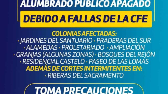 Las zonas que actualmente registran mayores incidencias son: Jardines del Santuario, Praderas del Sur, Alamedas, Proletariado, Ampliación, Granjas (algunas áreas), Bosques del Rejón, Residencial Castelo y Paseo de las Lomas, así como interrupciones intermitentes en Riberas del Sacramento.