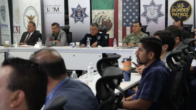 Ciudad Juárez.- La Secretaría de Seguridad Pública Municipal fungió como anfitrión durante la reunión binacional del protocolo de violencia fronteriza donde recibió a titulares y representantes de las diferentes corporaciones y agencias de seguridad de los tres niveles de gobierno tanto de esta ciudad como del vecino país.