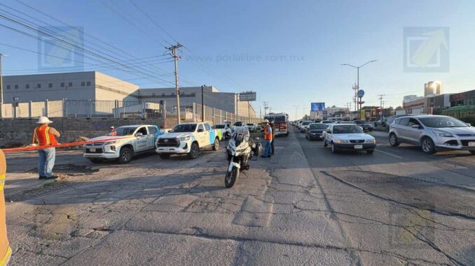 El incidente se registró cuando maquinaria utilizada para trabajos de excavación impactó de manera accidental una tubería de cuatro pulgadas que transporta gas natural, lo que ocasionó una liberación considerable del combustible. De inmediato, trabajadores del área dieron aviso a las autoridades para evitar riesgos mayores en esta transitada vialidad y en los negocios cercanos al parque industrial Saucito.