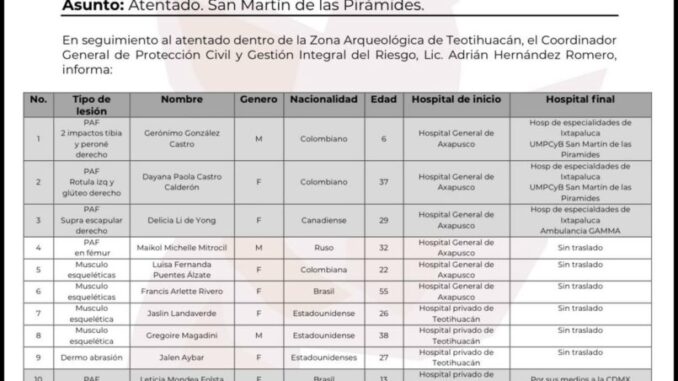 El tiroteo ocurrió la mañana del lunes, en la Pirámide de la Luna, donde un sujeto armado abrió fuego contra visitantes desde una zona elevada en un momento de alta afluencia turística, lo que provocó escenas de pánico y una estampida.