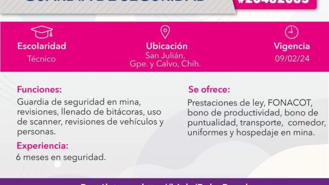 La Secretaría del Trabajo y Previsión Social (STPS), a través del Servicio Estatal de Empleo (SEE), invita a la ciudadanía en general a participar en el reclutamiento para ocupar vacantes como guardia de seguridad en mina San Julián, ubicada en Guadalupe y Calvo.