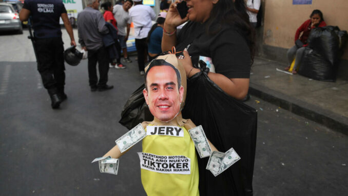 Una mujer sostiene un muñeco de fin de año con el rostro del presidente interino de Perú, José Jerí, este martes en Lima (Perú). EFE/ Paolo Aguilar