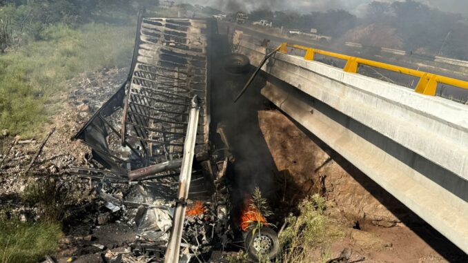 La tarde de este sábado, un tráiler con carga quedó reducido a chatarra tras incendiarse sobre la carretera vía corta Parral–Chihuahua, a causa de una presunta falla mecánica en el motor.