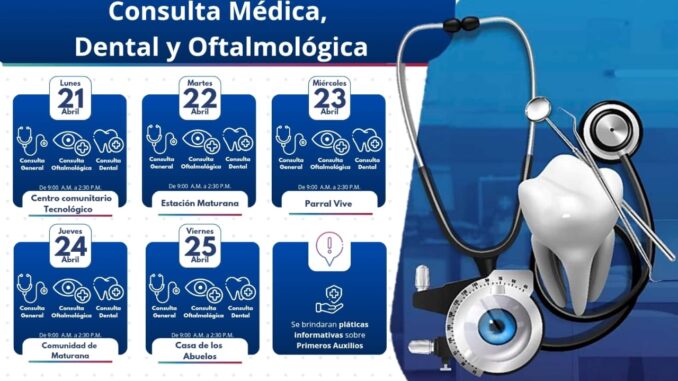 Del lunes 21 al viernes 25 de abril, personal capacitado estará brindando consultas generales, atención dental y servicios de oftalmología. Esta iniciativa tiene como finalidad ofrecer soluciones básicas de salud y detectar de manera oportuna cualquier situación que requiera seguimiento especializado.
