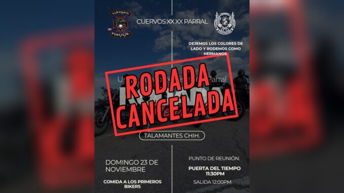 La Unión de Motociclistas de Parral anunció la suspensión de la rodada prevista para este fin de semana, una decisión tomada luego de valorar el clima de tensión que persiste en la región sur del estado tras los hechos violentos recientemente registrados.