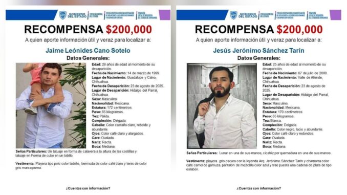 La Comisión Local de Búsqueda, en coordinación con la Fiscalía de Distrito Zona Sur, ofrece recompensa de 200 mil pesos a quien proporcione información veraz, útil y comprobable, que contribuya a la localización de Jesús Gerónimo Sánchez Tarín y otros 200 mil pesos, por información para encontrar a Jaime Leónides Cano Sotelo, quienes fueron reportados como desaparecidos el 23 de agosto de 2025, en la ciudad de Parral.
