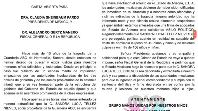 En una carta dirigida a la presidenta Claudia Sheinbaum y al fiscal general de la República, Alejandro Gertz Manero, el Grupo Manos Unidas por Nuestros Niños, conformado por familiares de las víctimas de aquel suceso, afirmó haberse enterado de “manera extraoficial” de la detención de Sandra Téllez, en Eloy, Arizona, EE.UU.