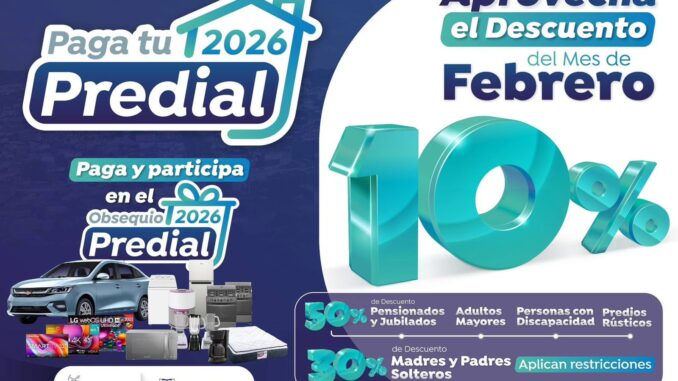 El Gobierno de Parral invita a aprovechar el 10 por ciento de descuento en el pago del Impuesto Predial durante el mes de febrero, incentivo que busca apoyar la economía familiar y fomentar la cultura del cumplimiento. Además, quienes realicen su pago en este periodo participarán automáticamente en el sorteo de diversos obsequios por pronto pago.