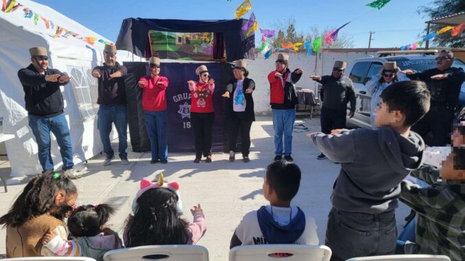 Ciudad Juárez.- Elementos adscritos a la Dirección de Prevención Social de la Secretaría de Seguridad Pública Municipal, realizaron una presentación de “Teatrino” en la Capilla de la Candelaria, como parte de las actividades de una posada navideña organizada para los niños que asisten a clases de catecismo