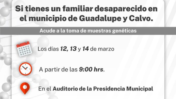 Para tal efecto, se está convocando a los interesados, para que acudan los días 12, 13 y 14 de marzo, a partir de las 09:00 horas al Auditorio de la Presidencia Municipal de Guadalupe y Calvo, en donde personal del área química de la Dirección de Servicios Periciales, realizarán la extracción de muestras sanguíneas.