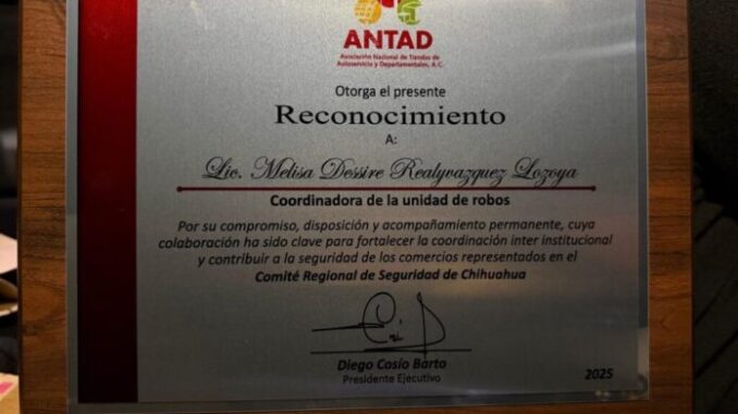 En el marco de la reunión mensual entre la Unidad Especializada en Investigación de Delitos de Robo de la Fiscalía de Distrito Zona Centro y la Asociación Nacional de Tiendas de Autoservicio y Departamentales (ANTAD), se entregó un reconocimiento especial a la coordinadora Melisa Dessire Realivazquez Lozoya.