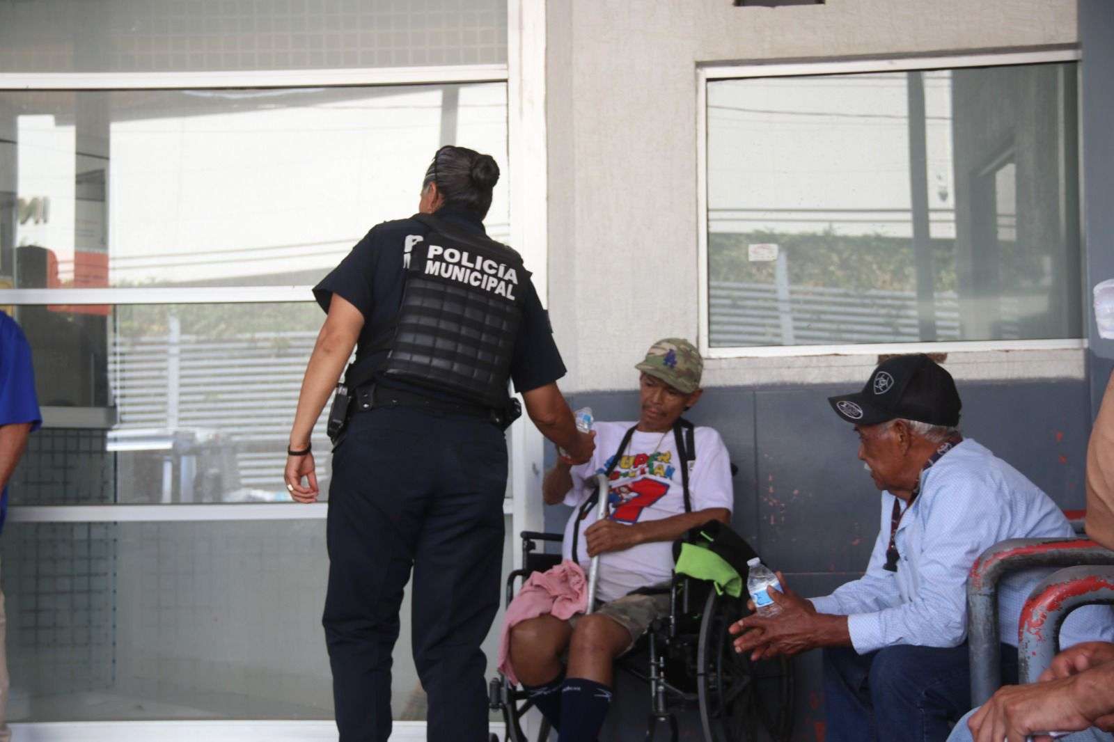 Ciudad Juárez.- Agentes de la Secretaría de Seguridad Pública Municipal, el día de hoy salieron a visitar a los lugares en donde se acumulan las personas bajo las altas temperaturas, sobre todo en el exterior de hospitales, en donde familiares están en espera de noticias de la evolución médica de sus pacientes.