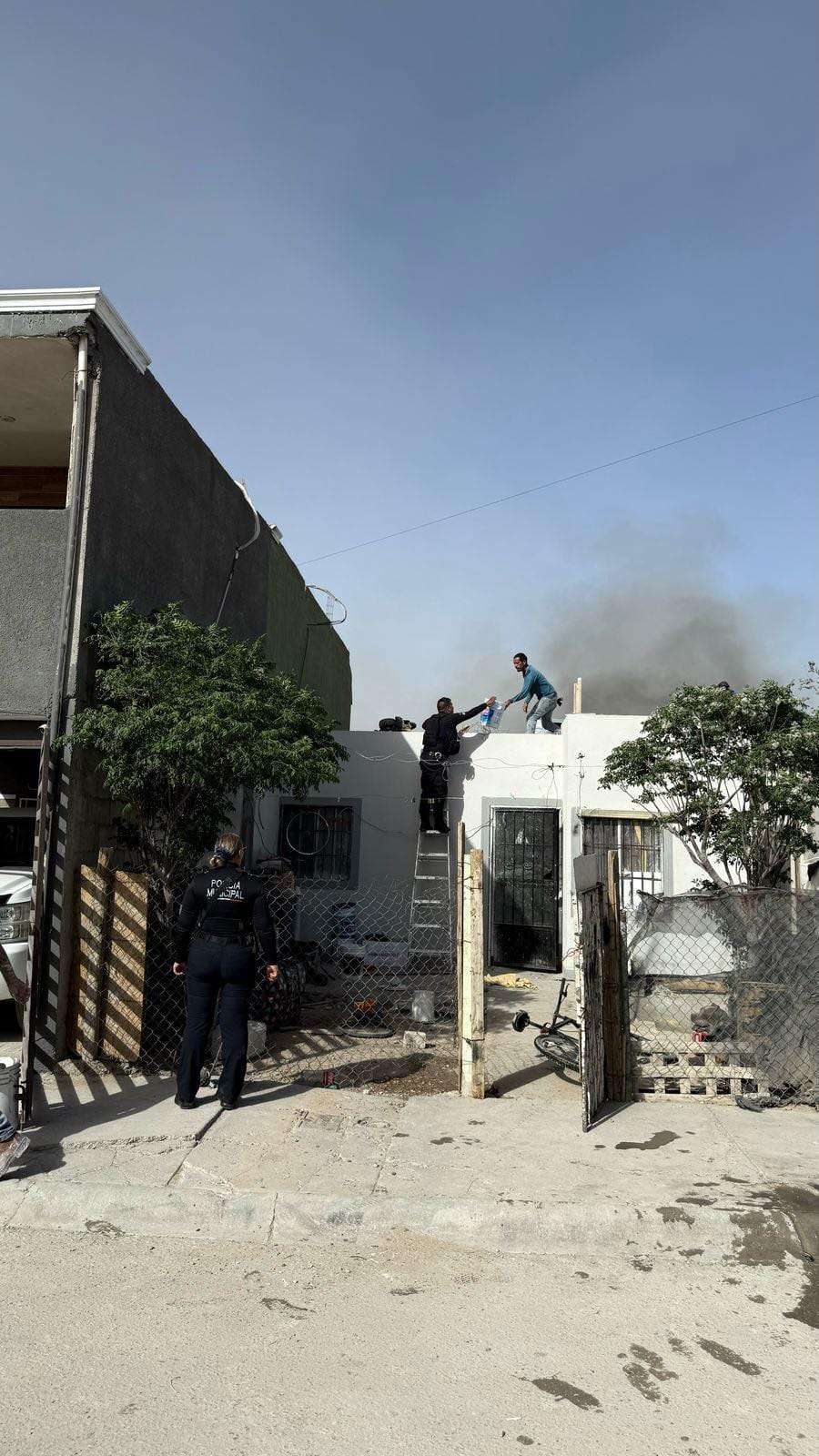 Ciudad Juárez.- Elementos de la Secretaría de Seguridad Pública Municipal ayudaron a sofocar un incendio en una casa habitación en la colonia Portal del Roble.