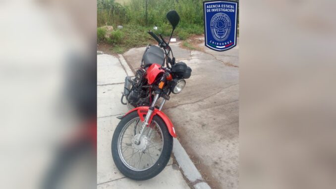 Elementos de la Agencia Estatal de Investigación (AEI), recuperaron una motocicleta de la marca Italika, línea 125, modelo 2019, de color rojo, que fue reportada robada, la tarde de ayer domingo en la ciudad de Parral.