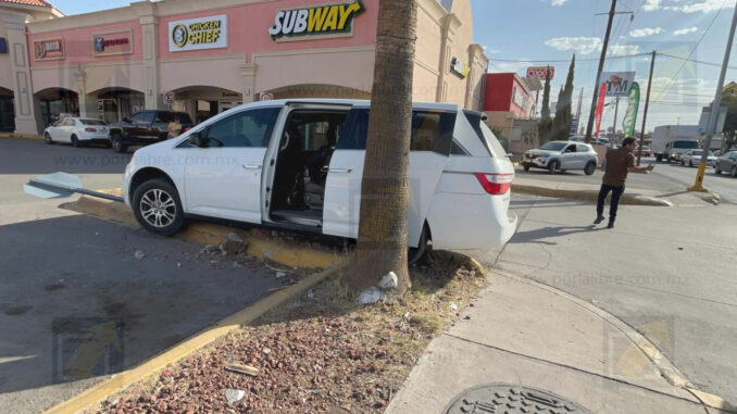 El conductor de un vehículo Toyota gris impactó contra el tripulante de una camioneta Odissey blanca que terminó lanzada contra un señalamiento vial de la plaza Monarca.