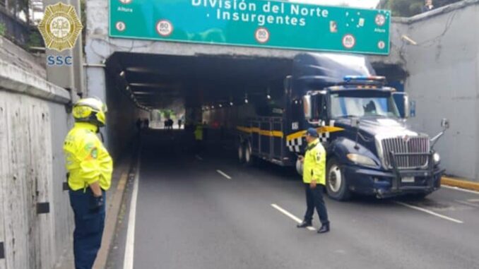 Un tráiler quedo atorado en el bajo puente ubicado entre el Viaducto Miguel Alemán y avenida Insurgentes Sur, justo a la altura de la colonia Escandón I Sección, lo que generó una afectación vial de importancia en dicha zona de la Ciudad de México.
