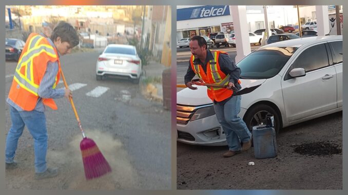 El regidor Vicencio Chávez volvió a intervenir directamente en las calles de Parral, ahora con trabajos de bacheo realizados —según informó— con recursos propios y acompañado de su hijo mayor.